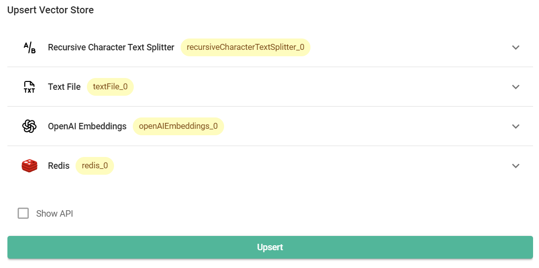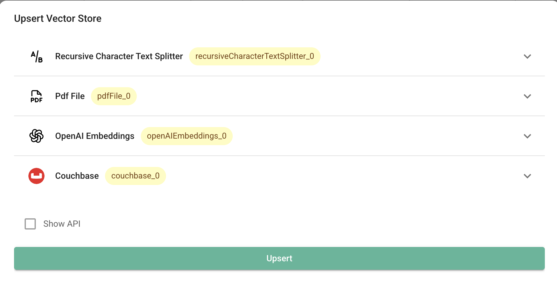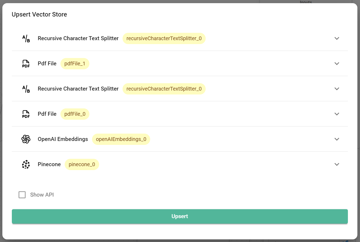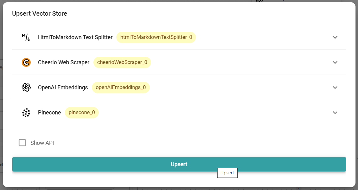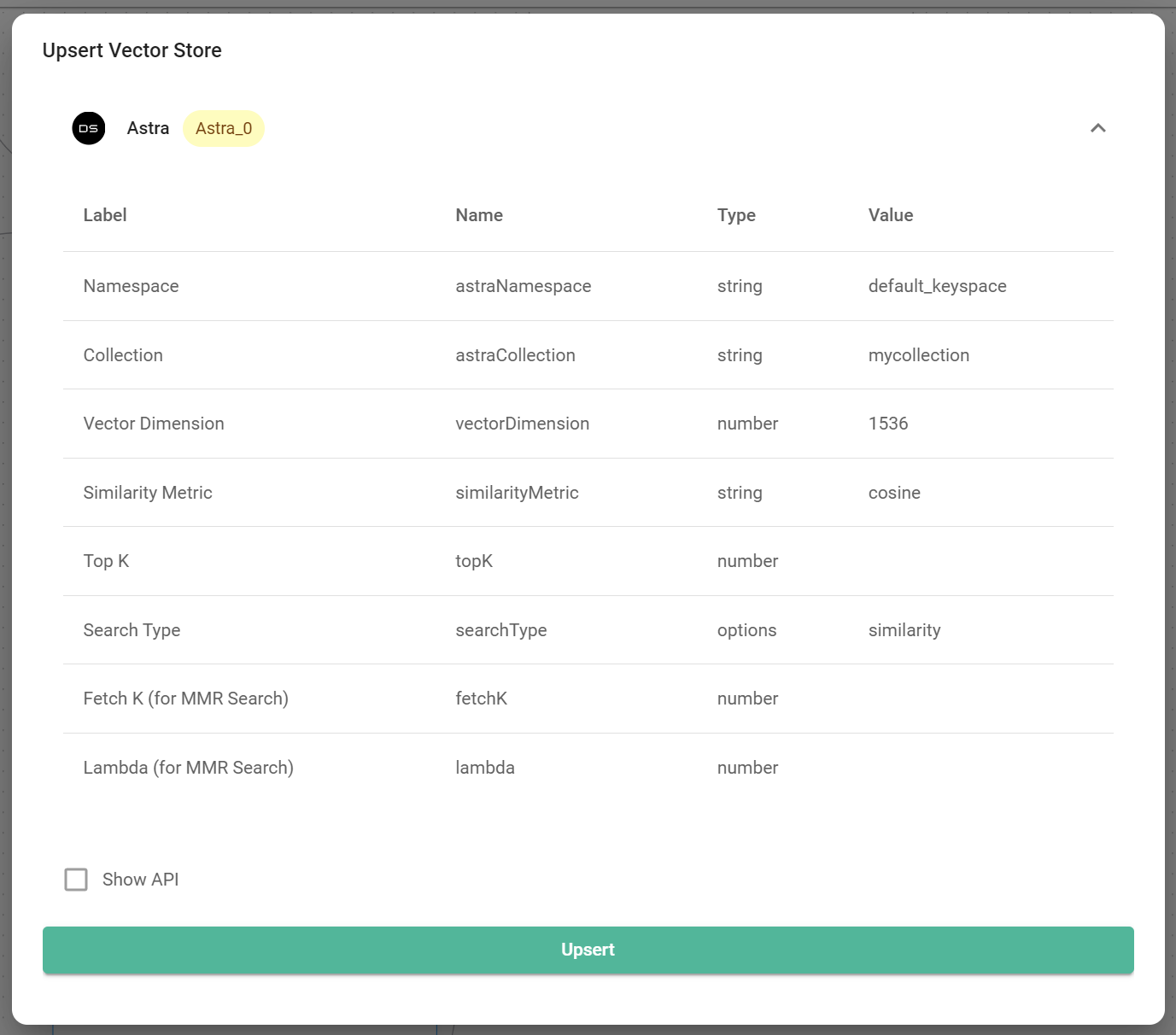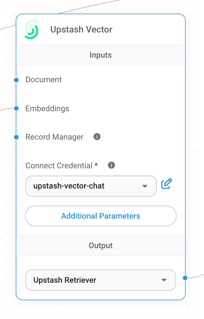 The Vector Store node is the end node of our upserting flow. It acts as the bridge between our aimicromind instance and our vector database, enabling us to send the generated embeddings, along with any associated metadata, to our target Vector Store index for persistent storage and subsequent retrieval.