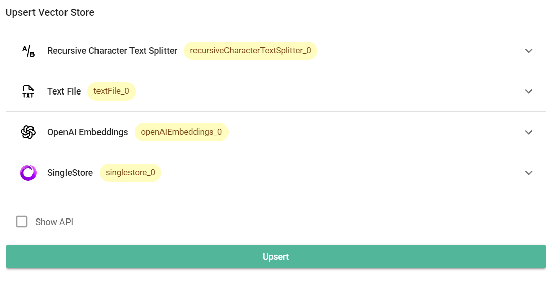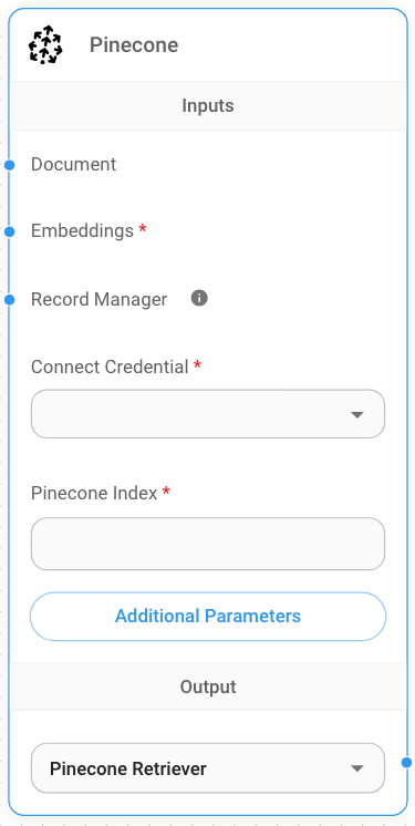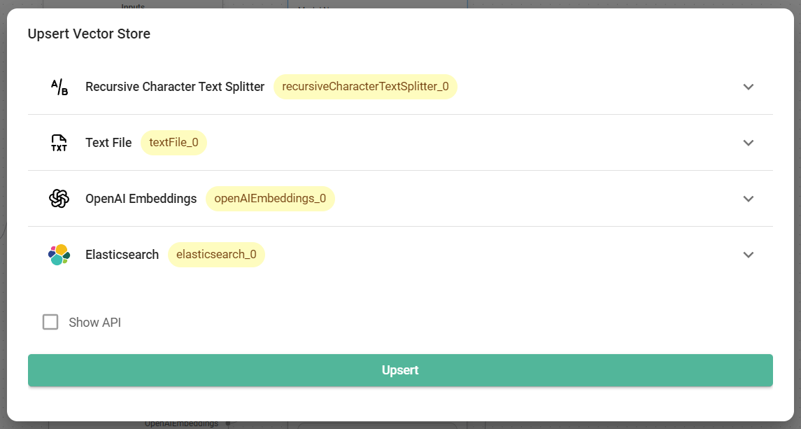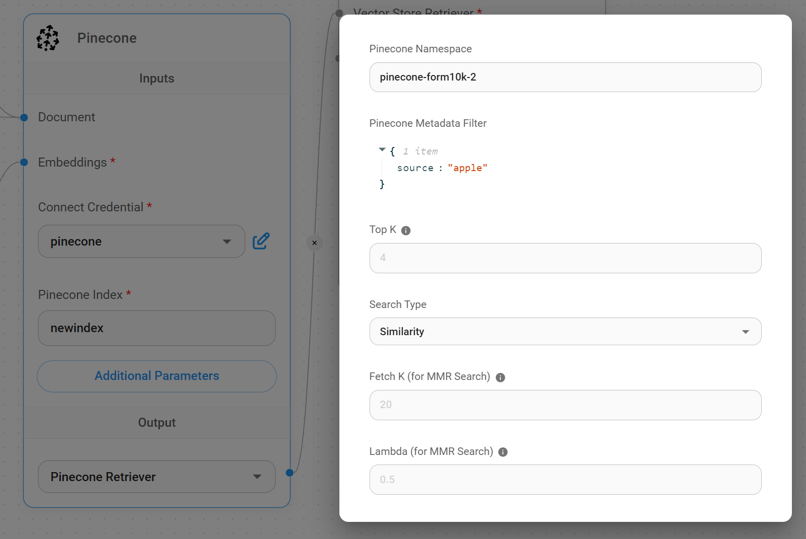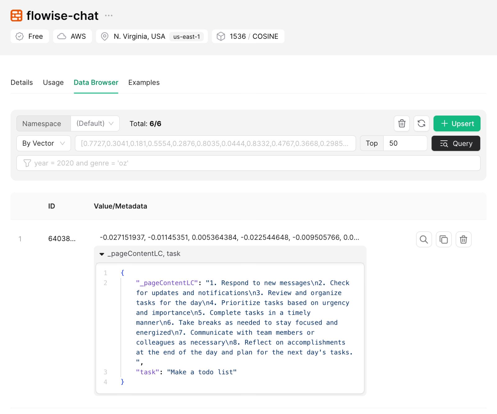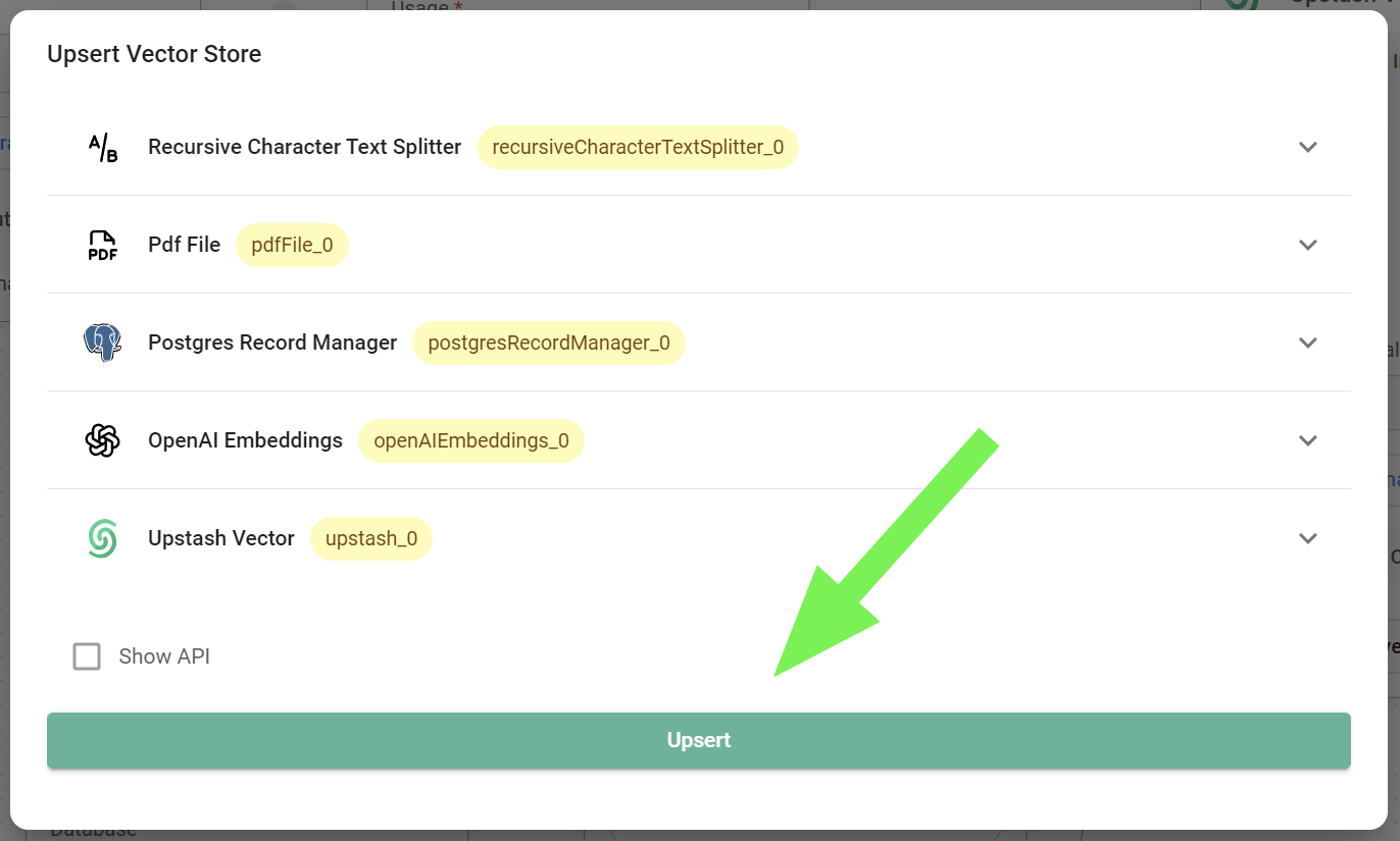 The Vector Store node is the end node of our upserting flow. It acts as the bridge between our aimicromind instance and our vector database, enabling us to send the generated embeddings, along with any associated metadata, to our target Vector Store index for persistent storage and subsequent retrieval.