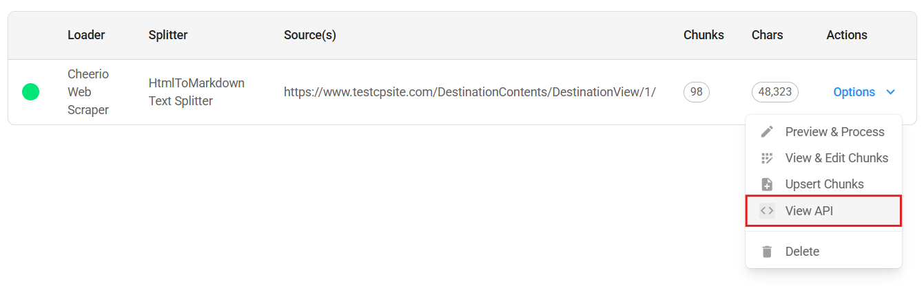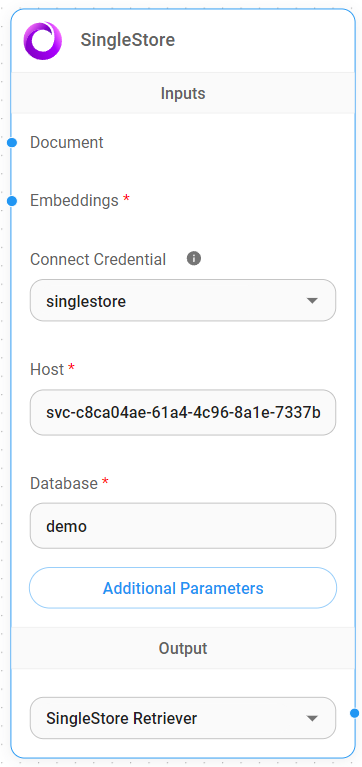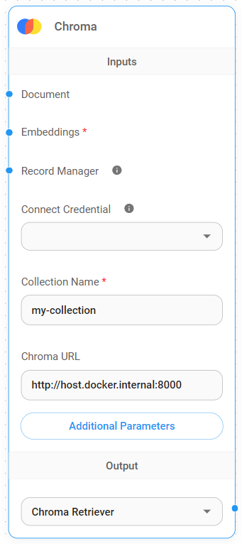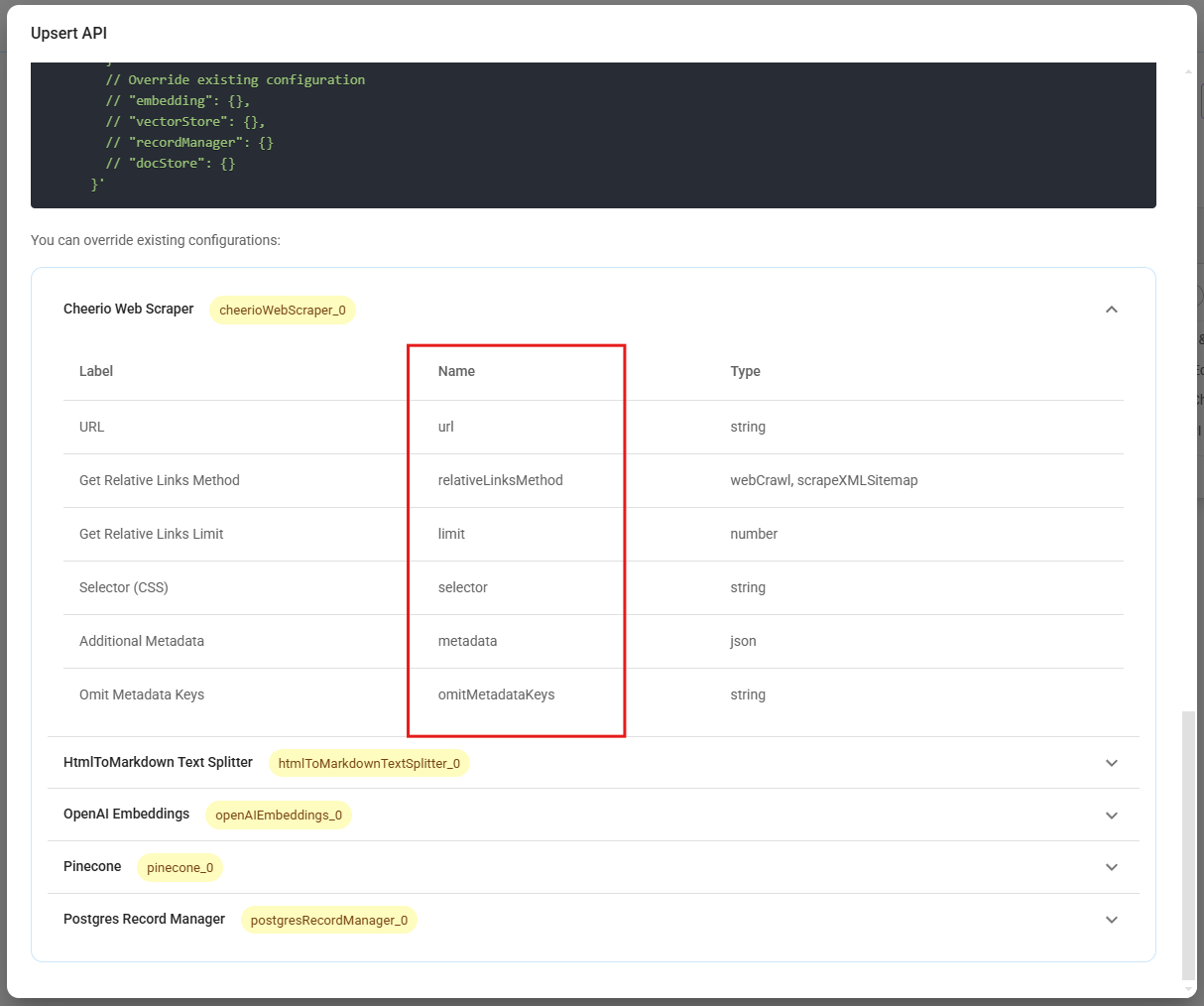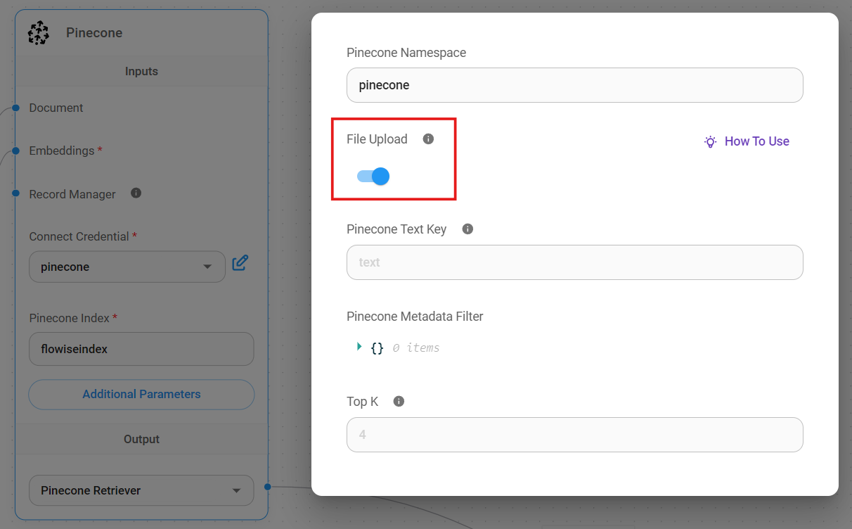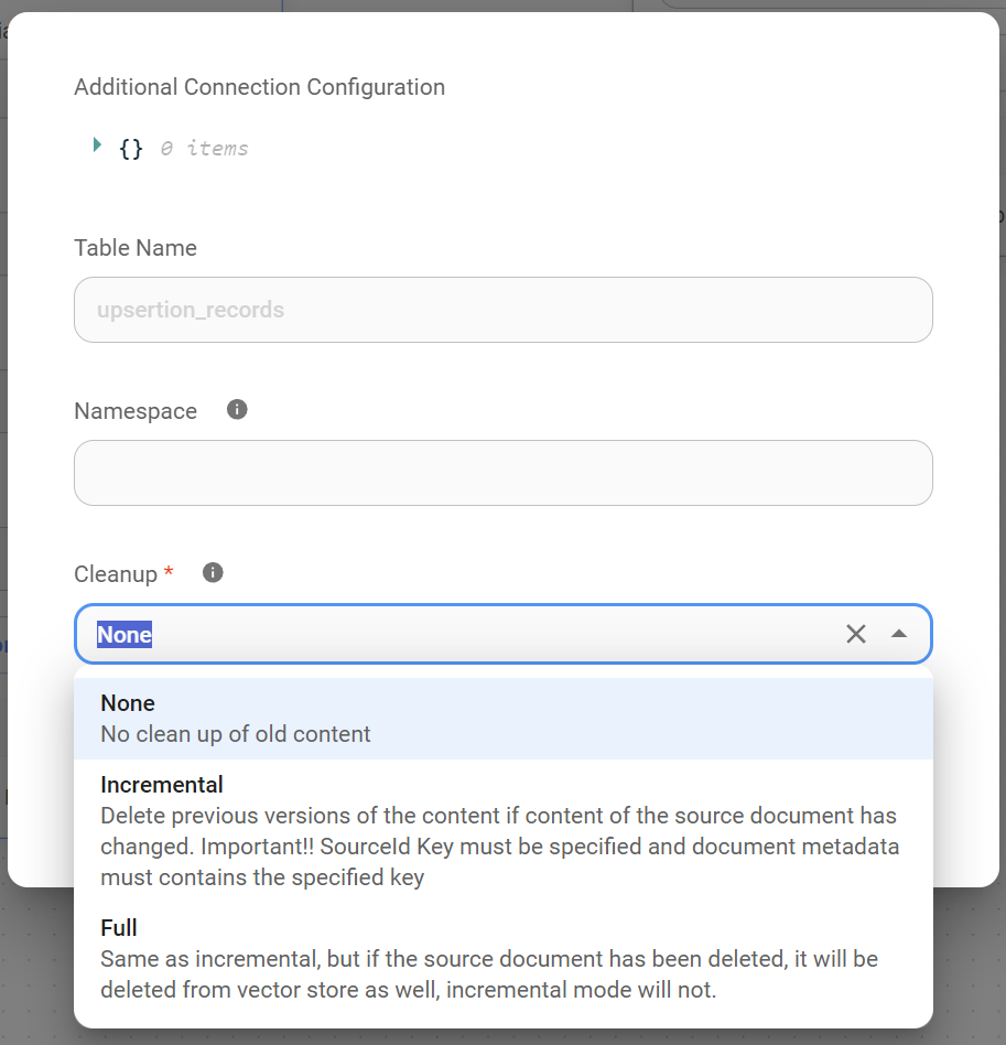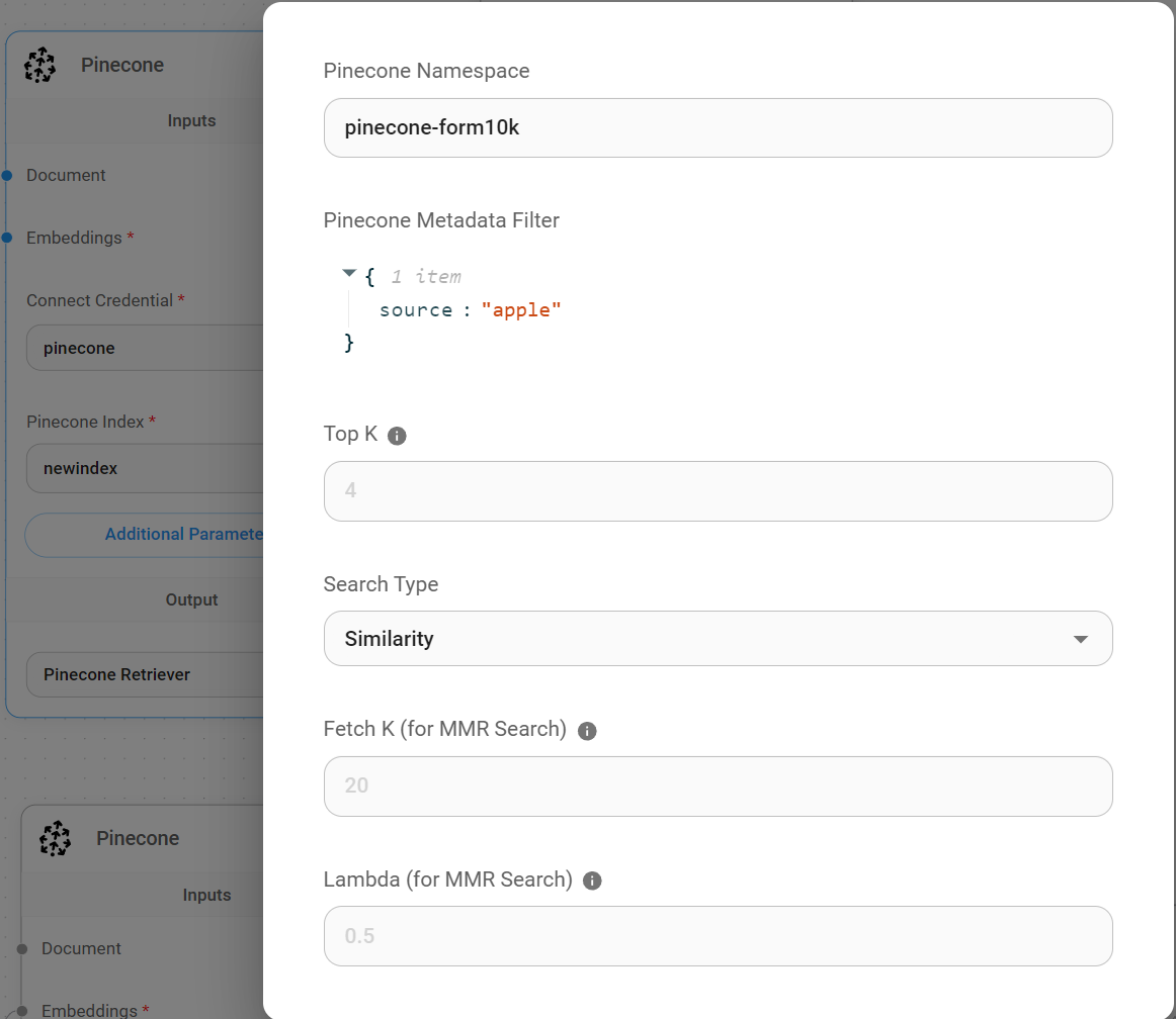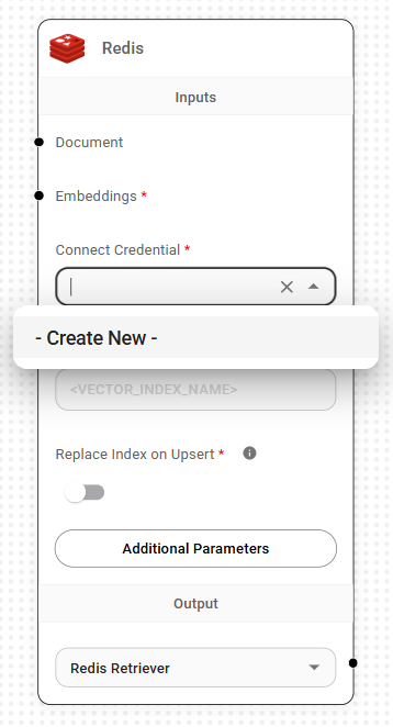 The Vector Store node is the end node of our upserting flow. It acts as the bridge between our aimicromind instance and our vector database, enabling us to send the generated embeddings, along with any associated metadata, to our target Vector Store index for persistent storage and subsequent retrieval.