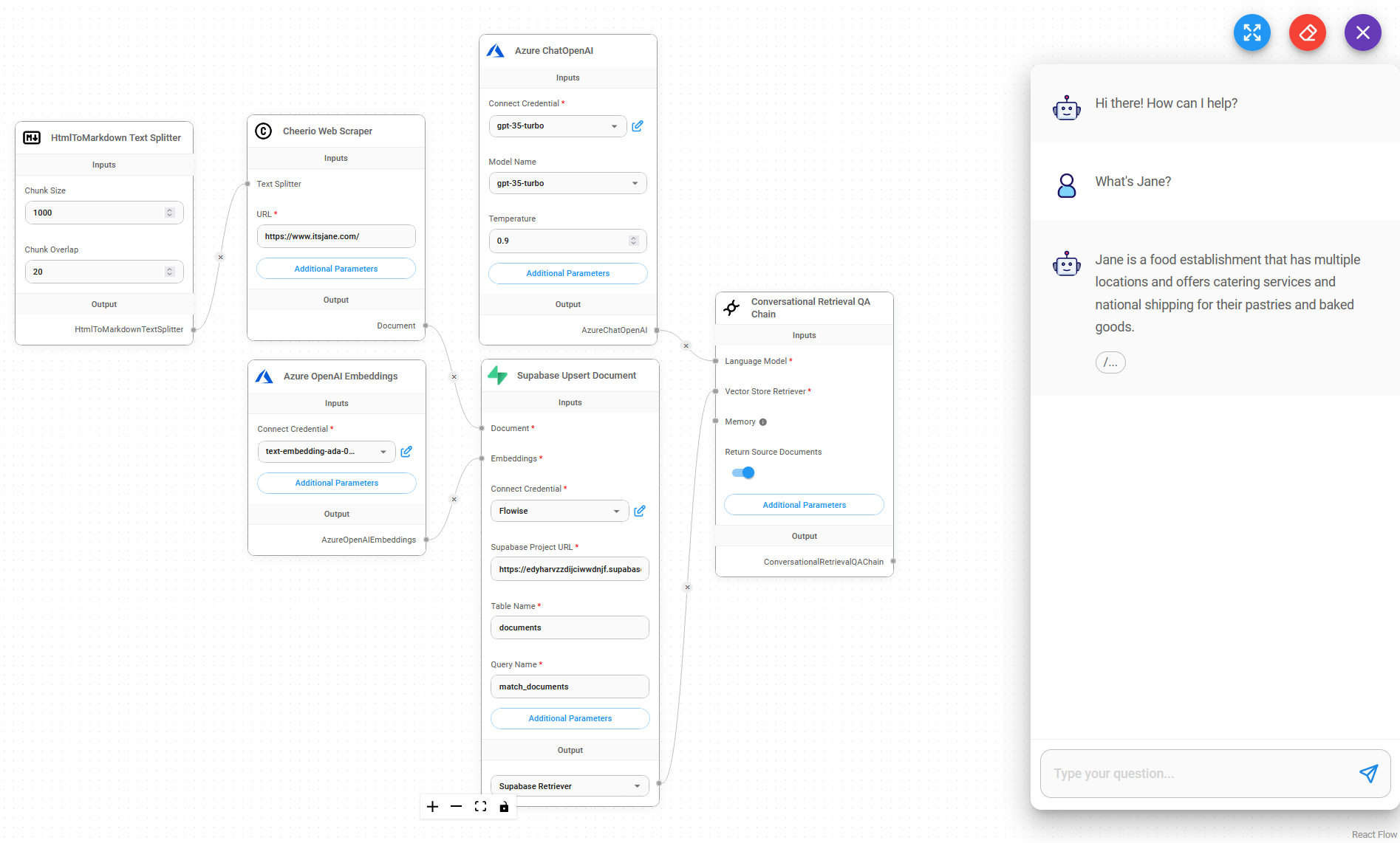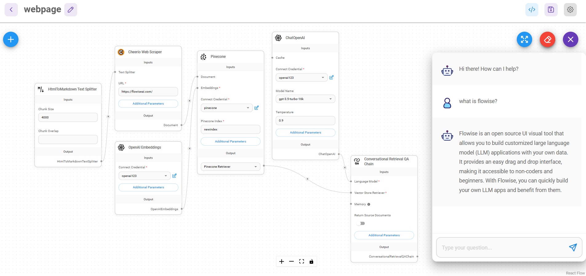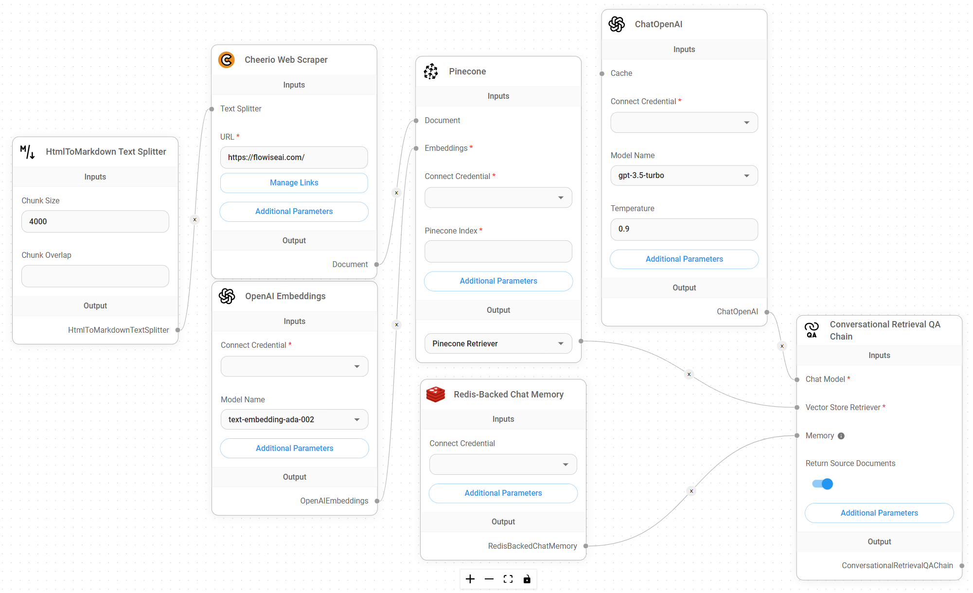 We are going to use Cheerio Web Scraper node to scrape links from a given URL and the HtmlToMarkdown Text Splitter to split the scraped content into smaller pieces.