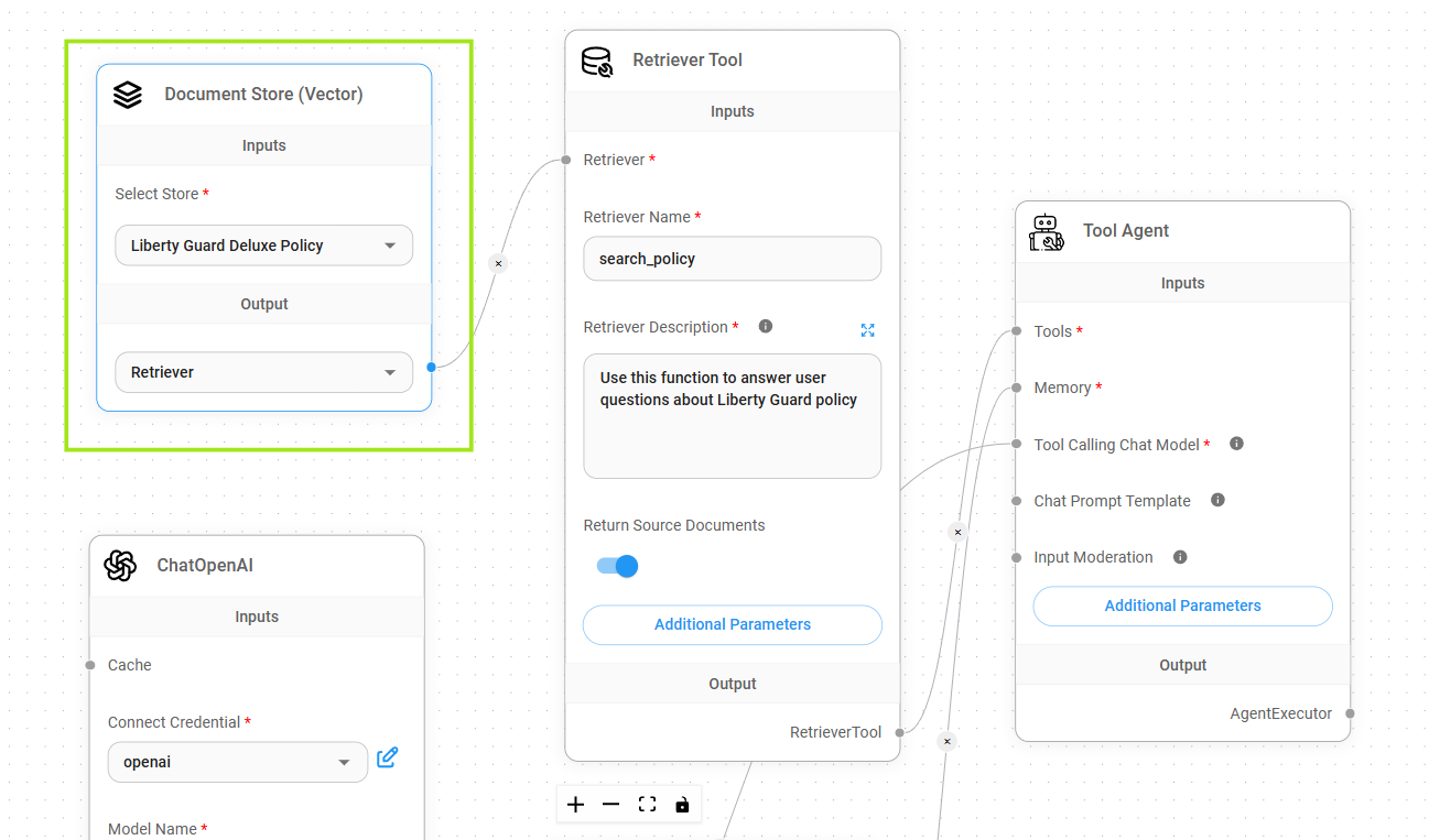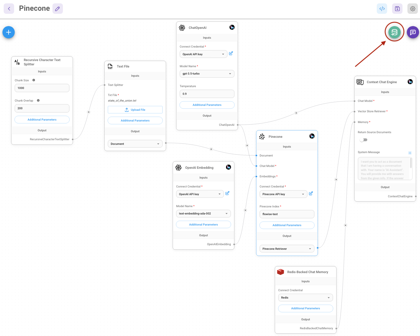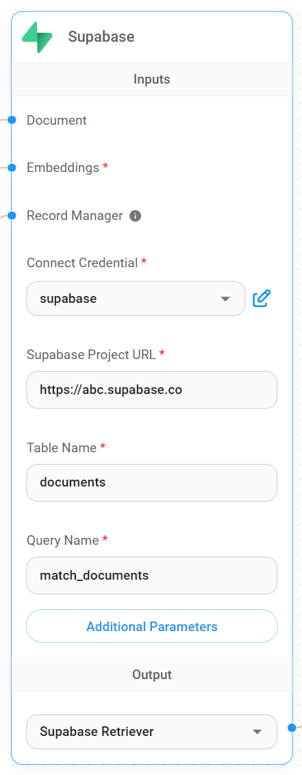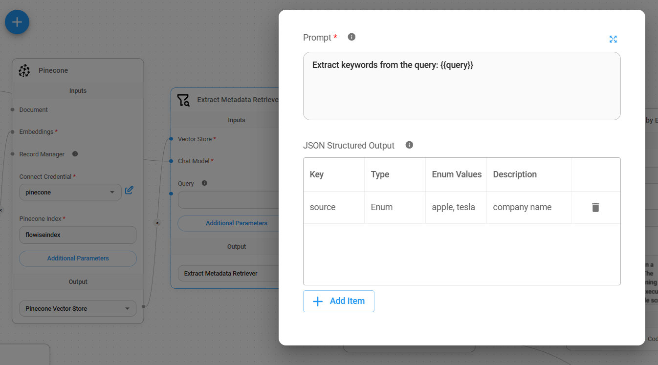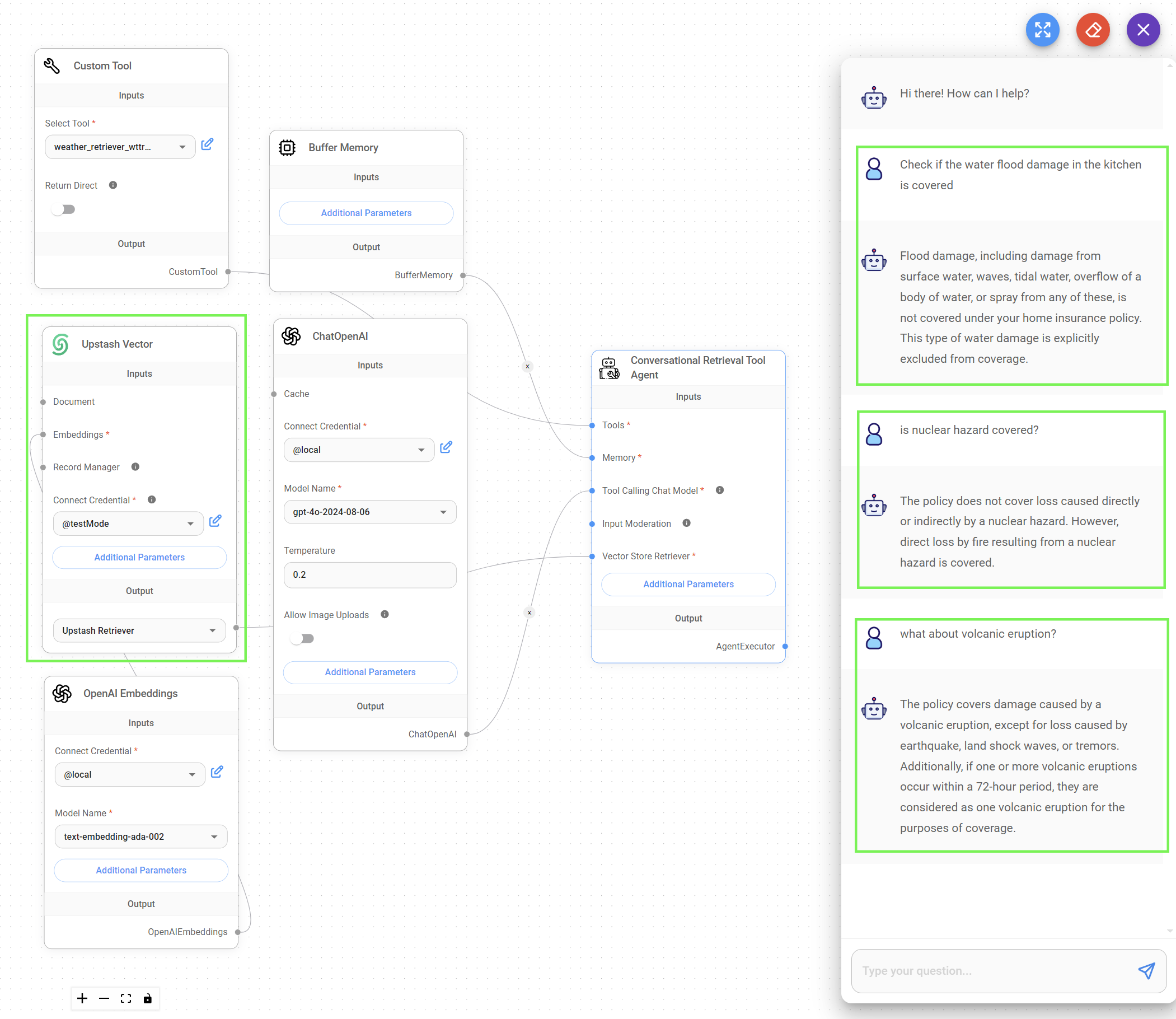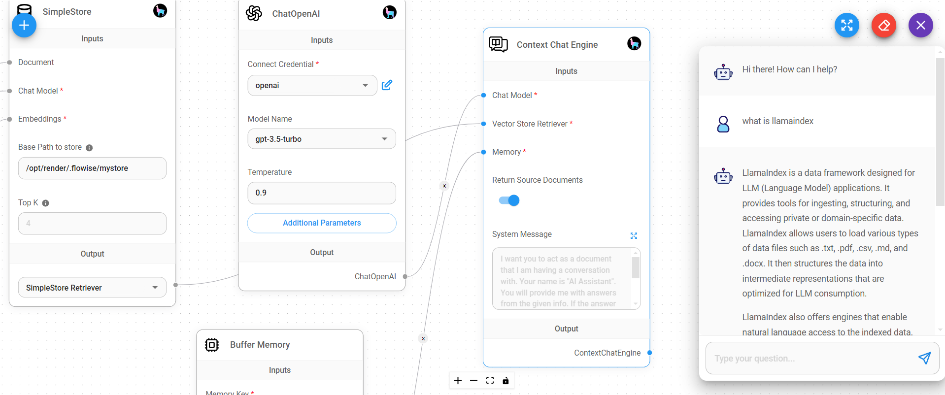 - Finally, the Vector Store node acts as the bridge between aimicromind and our database. It sends our embeddings, along with any associated metadata, to the designated Vector Store index.