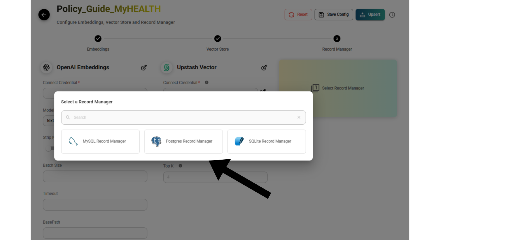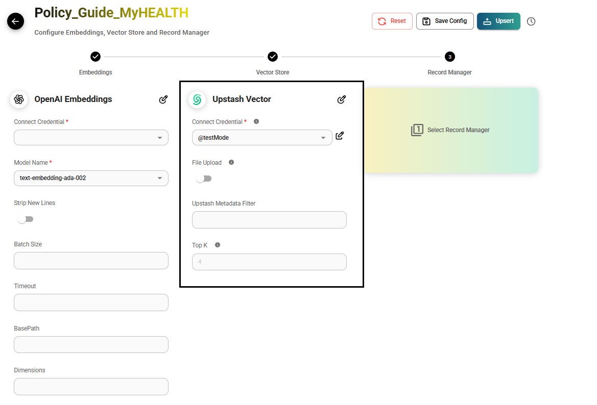 The Record Manager node is an optional but incredibly useful addition to our upserting flow. It allows us to maintain records of all the chunks that have been upserted to our Vector Store, enabling us to efficiently add or delete chunks as needed.