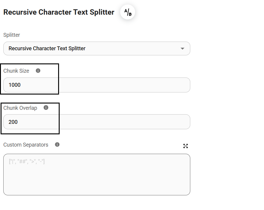 Tip: Note that Chunk Size and Chunk Overlap values are not additive. Selecting chunk_size=1200 and chunk_overlap=400 does not result in a total chunk size of 1600. The overlap value determines the number of tokens from the preceding chunk included in the current chunk to maintain context. It does not increase the overall chunk size.